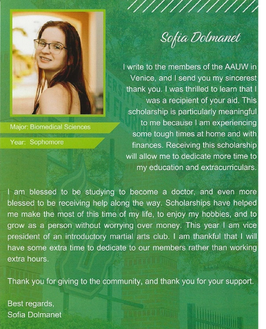 4 women have received the Non-Traditional Reentry Scholarship for women whose education has been interrupted, sponsored by Venice AAUW. In addition, the University of South Florida awarded 2 women in their STEM Program the Pat Weber Scholarship, also sponsored by Venice AAUW. Venice AAUW branch has also set up a scholarship at State College of Florida which will open in December.